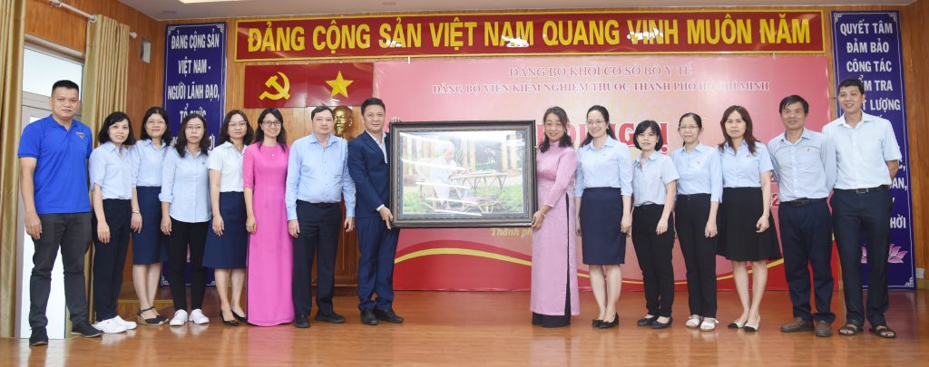 Đồng chí Trần Việt Hùng, Viện trưởng Viện Kiểm nghiệm thuốc Tp. Hồ Chí Minh, tặng Đảng bộ Viện bức tranh “Bác Hồ ngồi làm việc”