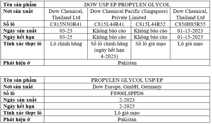Sau Cảnh báo sản phẩm y tế số 8/2023 của WHO vào tháng 12 năm 2023, Cơ quan Quản lý Dược phẩm của Pakistan (DRAP) đã điều tra về khả năng bị nhiễm tạp của các loại thuốc dạng  lỏng. DRAP đã phát hiện các thùng nghi ngờ chứa PROPYLEN GLYCOL, và các mẫu đã được thử nghiệm bởi Trung tâm phân tích thuốc của Pakistan. Các phân tích đã phát hiện mức độ nhiễm độc ethylen glycol không được chấp nhận, dao động từ 0,76% đến 100%. Từ tháng 1 đến tháng 3 năm 2024, DRAP đã ban hành 3 Cảnh báo nhanh về 5 lô sản phẩm PROPYLEN GLYCOL USP/EP của DOW bị nhiễm tạp.