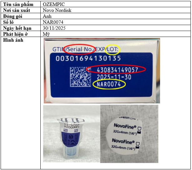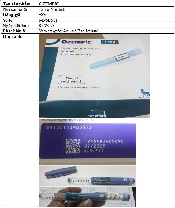Cảnh báo về sản phẩm y tế này của Tổ chức Y tế thế giới (WHO) đề cập đến ba lô OZEMPIC (semaglutid) giả. Sản phẩm giả này đã được phát hiện ở Brazil, Vương quốc Anh, Bắc Ireland (10/2023) và Hoa Kỳ (12/2023) và được cung cấp trong chuỗi cung ứng được quản lý.