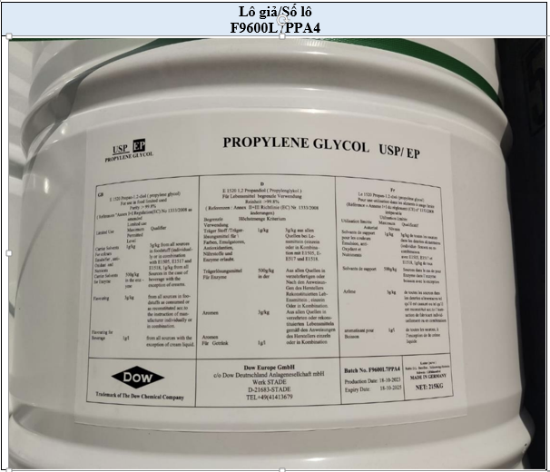 Phát hiện PROPYLEN GLYCOL USP/EP giả tại