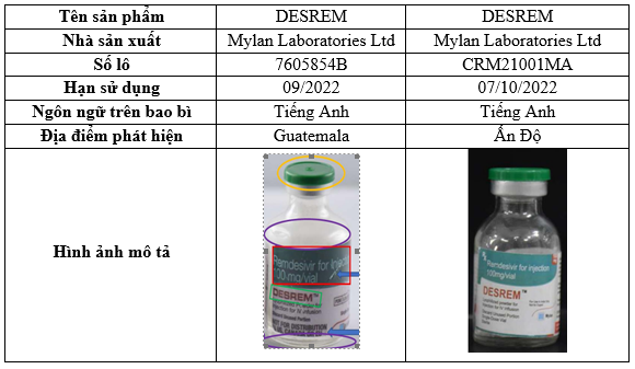 Cảnh báo này đề cập đến hai lô thuốc DESREM Remdesivir for Injection 100mg/vial (thuốc tiêm DESREM Remdesivir 100mg/lọ). Các lô hàng giả đã được xác định ở Guatemala và Ấn Độ đã được báo cáo cho WHO vào tháng 2 năm 2022.