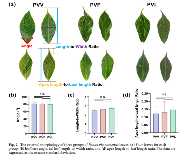 Hình 2.  Hình ảnh lá của 3 loài Panax vietnamensis Ha et Grushv. (PVV), Panax vietnamensis var. fuscidiscus (PVF), và Panax vietnamensis var. langbianensis (PVL) (theo tài liệu tham khảo)