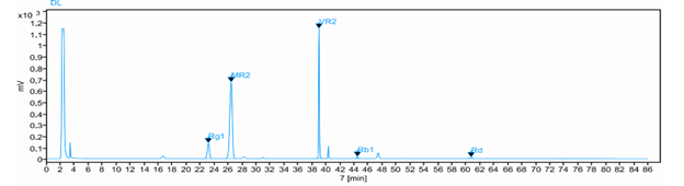 • Định tính, định lượng các thành phần saponin bằng HPLC-DAD và HPLC-ELSD: Định tính và định lượng 8 saponin đặc trưng nhất của Sâm Việt Nam (Majonoside R2, Ginsenoside Rg1, Ginsenosid Rb1, Ginsenosid Rd, Vinaginsenoside R1, Vinaginsenoside R2, Ginsenoside Rh1). Phân tích chuyên sâu với đầu dò ELSD, giúp phát hiện các chất kém hấp thu UV, đặc biệt là hợp chất Majonoside R2, vốn là marker đặc trưng nhất để phân biệt Sâm Việt Nam với các loài sâm khác