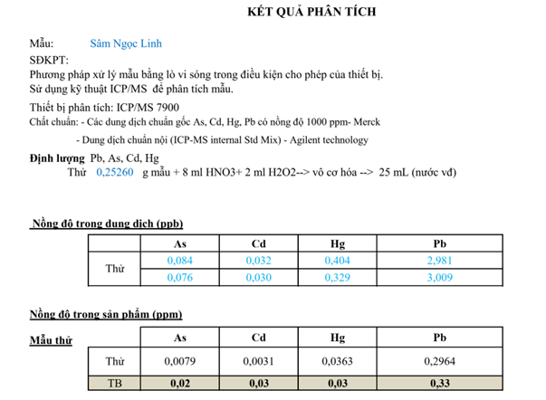 Hình 6.  Kết quả phân tích hàm lượng Asen, chì, cardimi, thủy ngân trong mẫu Panax vietnamensis Ha et Grushv. (PVV)