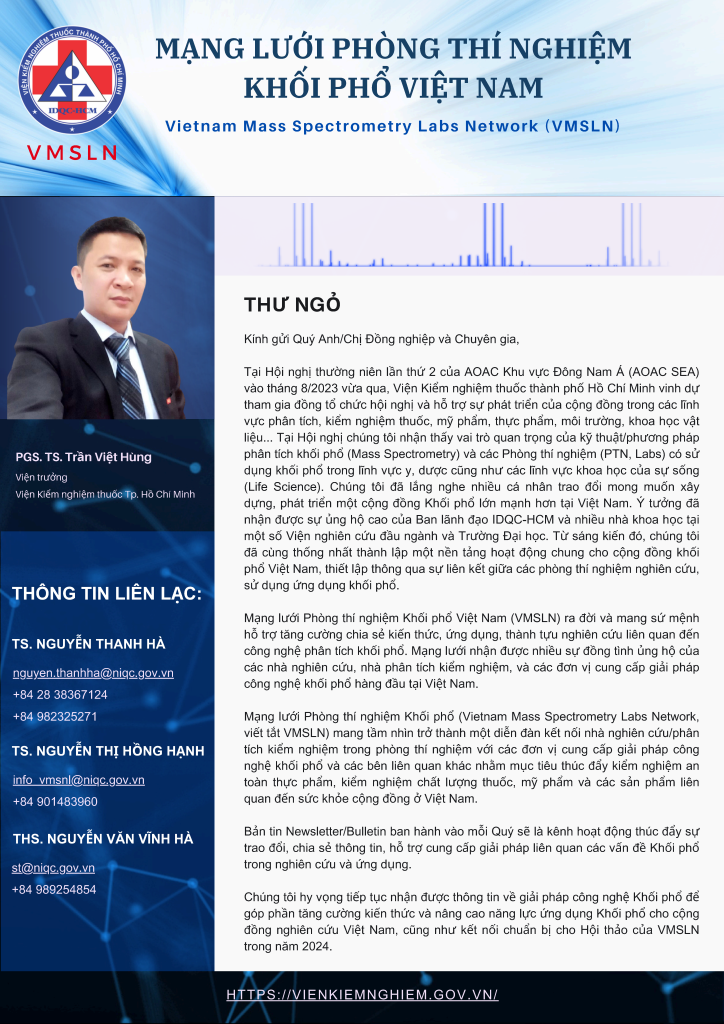 Mạng lưới Phòng thí nghiệm Khối phổ Việt Nam (VMSLN) Giới thiệu về Mạng lưới phòng thí nghiệm khối phổ Việt Nam (VMSLN) Ngày đăng 25/04/202425/04/2024 - Tác giả: IDQC Mạng lưới phòng thí nghiệm khối phổ Việt Nam – VMSLN