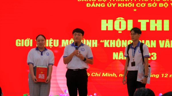 Thí sinh Đặng Lê Minh Khang – sinh viên năm 3 Đại học Y dược TPHCM đại diện cho Đoàn TNCS Hồ Chí Minh – Đại học Y dược TPHCM thuyết trình phần thi về mô hình kệ sách Hồ Chí Minh