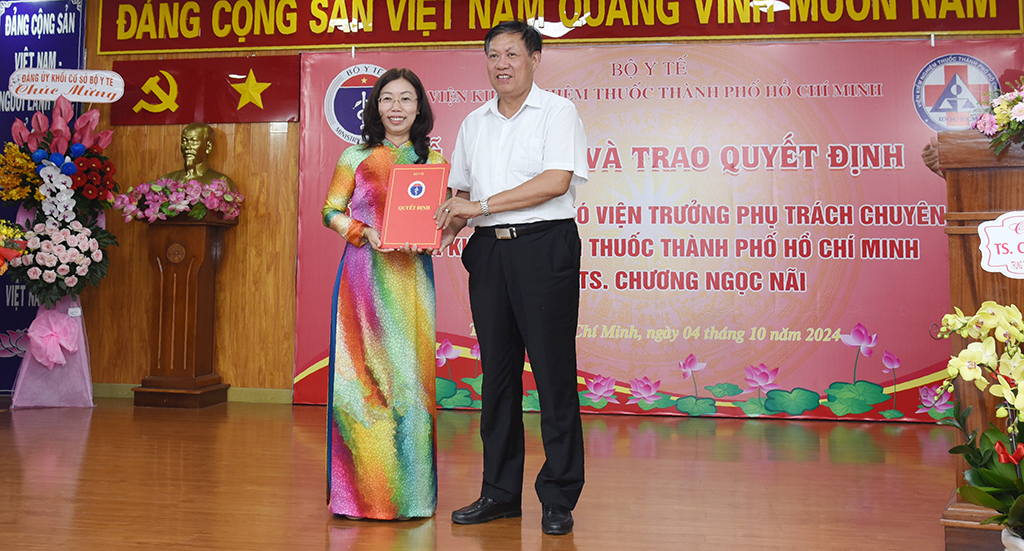 Căn cứ Quyết định số 2858/QĐ-BYT ngày 25/9/2024 của Bộ trưởng Bộ Y tế về bổ nhiệm lại chức vụ Phó Viện trưởng phụ trách chuyên môn Viện Kiểm nghiệm thuốc thành phố Hồ Chí Minh đối với TS. Chương Ngọc Nãi, ngày 04/10/2024 Viện Kiểm nghiệm thuốc thành phố Hồ Chí Minh phối hợp với Vụ Tổ chức cán bộ, Bộ Y tế long trọng tổ chức Lễ công bố và trao quyết định cho đồng chí Chương Ngọc Nãi.