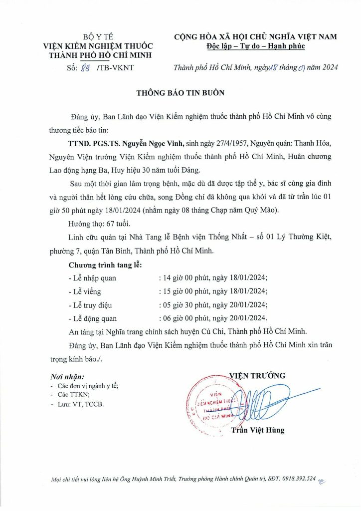 Phó Giáo sư Tiến sĩ, Dược sĩ, Thầy thuốc nhân dân (PGS. TS. DS., TTND) Nguyễn Ngọc Vinh là thầy thuốc, nhà giáo có cuộc đời và sự nghiệp hoạt động phần lớn gắn liền với ngành kiểm nghiệm, nguyên là Viện Trưởng Viện kiểm nghiệm thuốc thành phố Hồ Chí Minh từ năm 2008 đến năm 2017, đã từ trần vào lúc 1 giờ 50 phút ngày 18/01/2024 (nhằm ngày 08 tháng chạp năm Quý Mão), hưởng thọ 67 tuổi, sau một thời gian mắc bệnh hiểm nghèo.