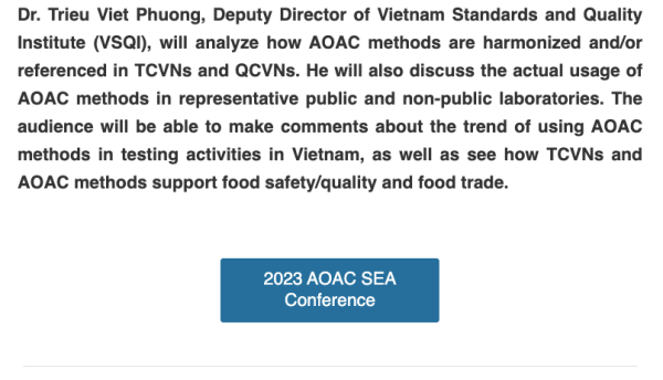 In this 2023 AOAC SEA 2nd Annual Conference, the Institute of Drug Quality Control in Ho Chi Minh City (IDQC-HCM) is honored to partner up with AOAC SEA to co-organize the 2023 AOAC SEA conference. Individuals and organizations will have the chance to learn and find collaborations to enhance competency in laboratory testing and support regional and international trade. Being in this environment, they will be exposed to the ins and outs of the analytical testing system, including testing, calibration, inspection, certification, accreditation, and market surveillance. The process and progress of harmonization of standards and technical regulations in Vietnam will also be revealed.